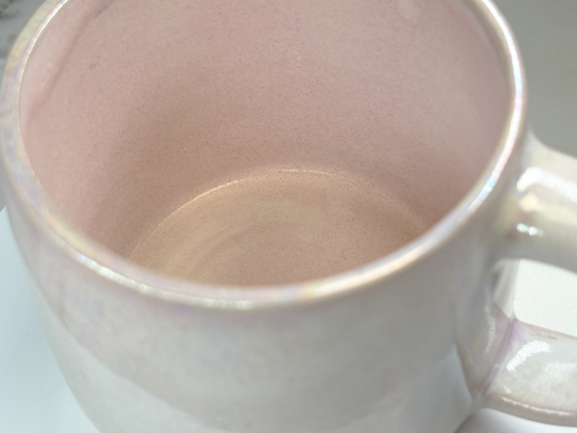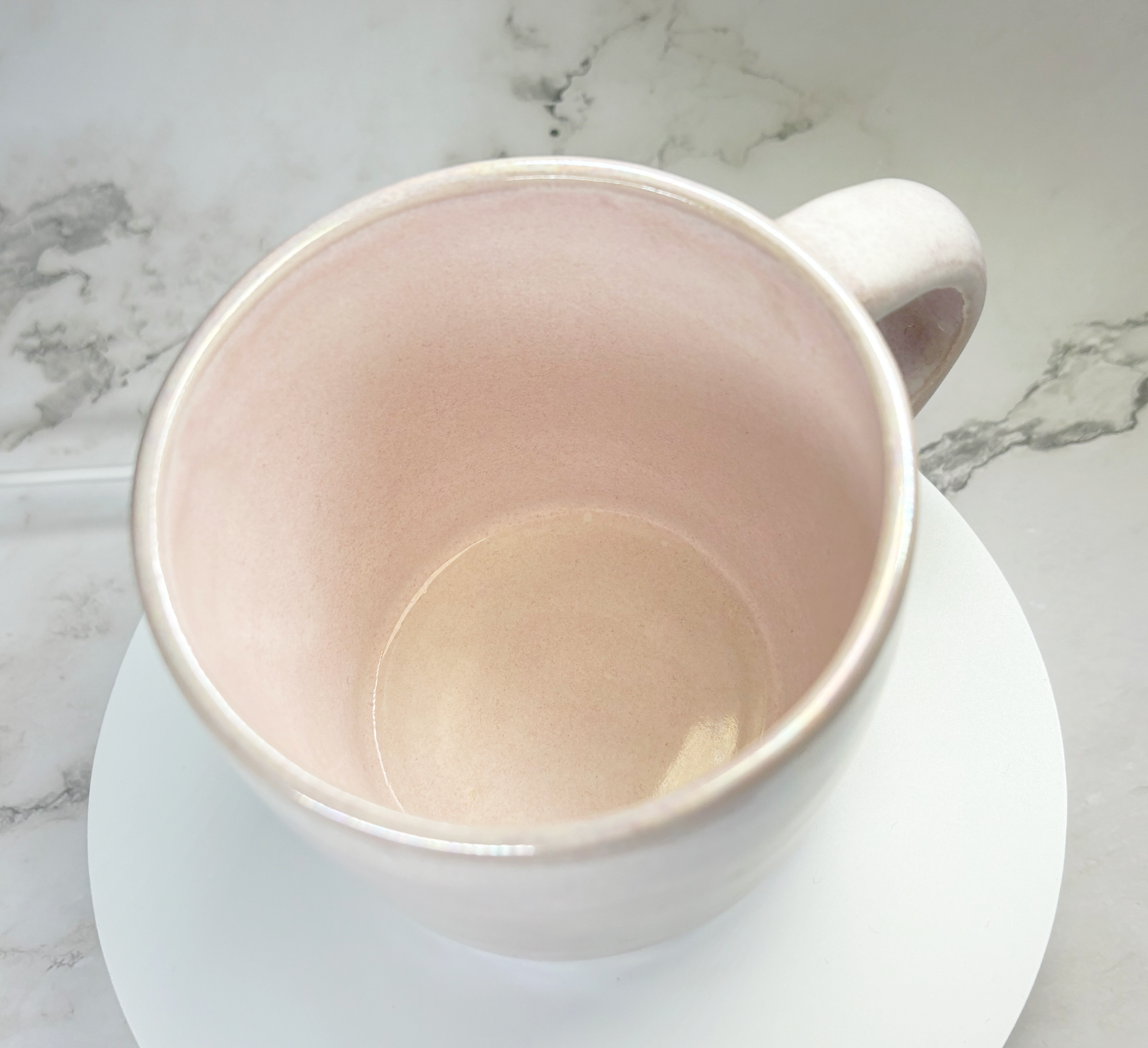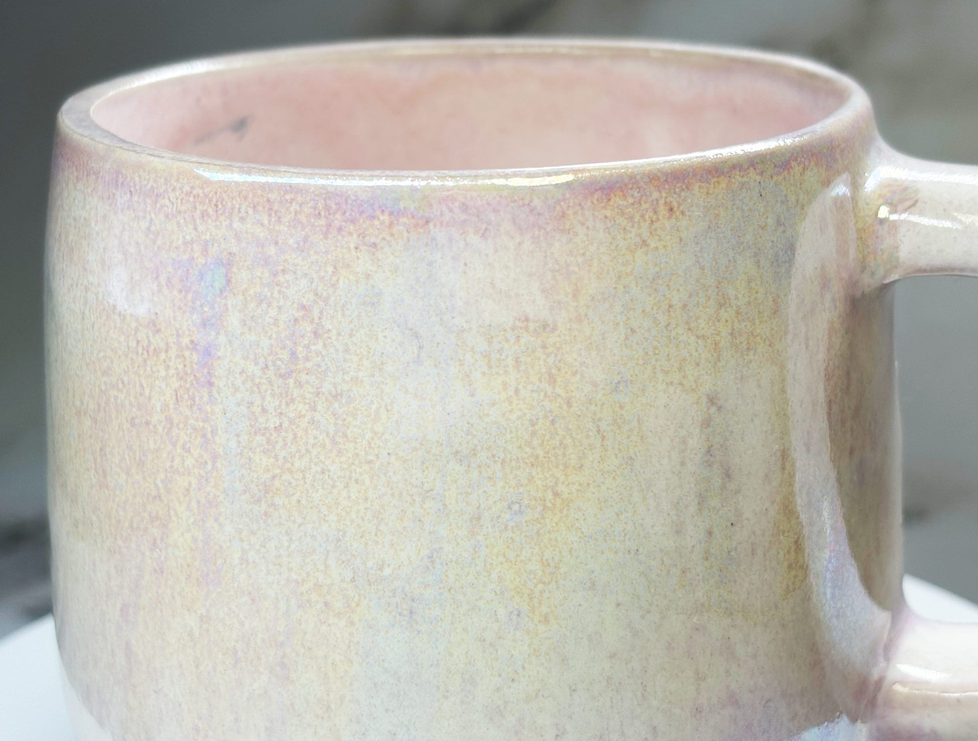 A handcrafted mug adorned in a shimmering iridescent light pink coat.